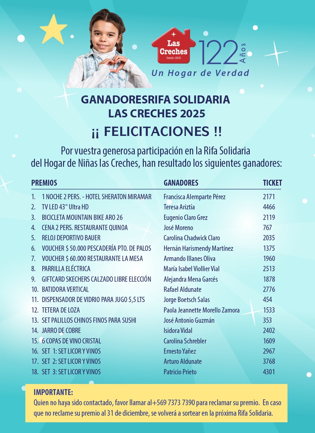 Hogar Las Creches agradece su colaboración en nuestra rifa solidaria, estos son los ganadores.